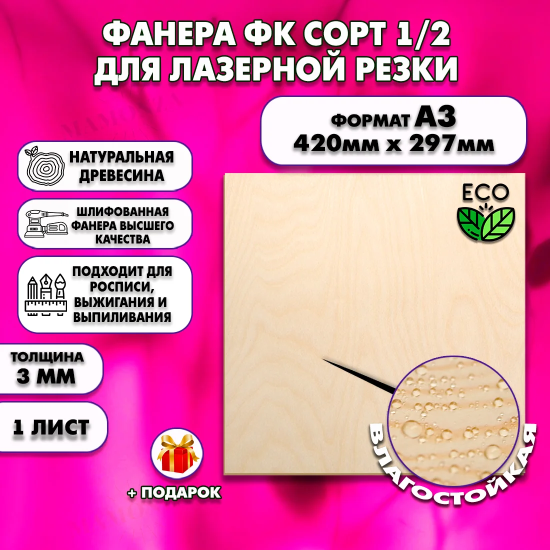 Зачем переплачивать за сорт 1/1, если видна только одна сторона? Фанера ФК 1/2 (3 мм, 420×297 мм) — 80% качества премиума за меньшую цену. Лицевая сторона безупречна, обратная скрыта стеной или каркасом. Вес листа 0.3 кг, площадь 0,12 м².