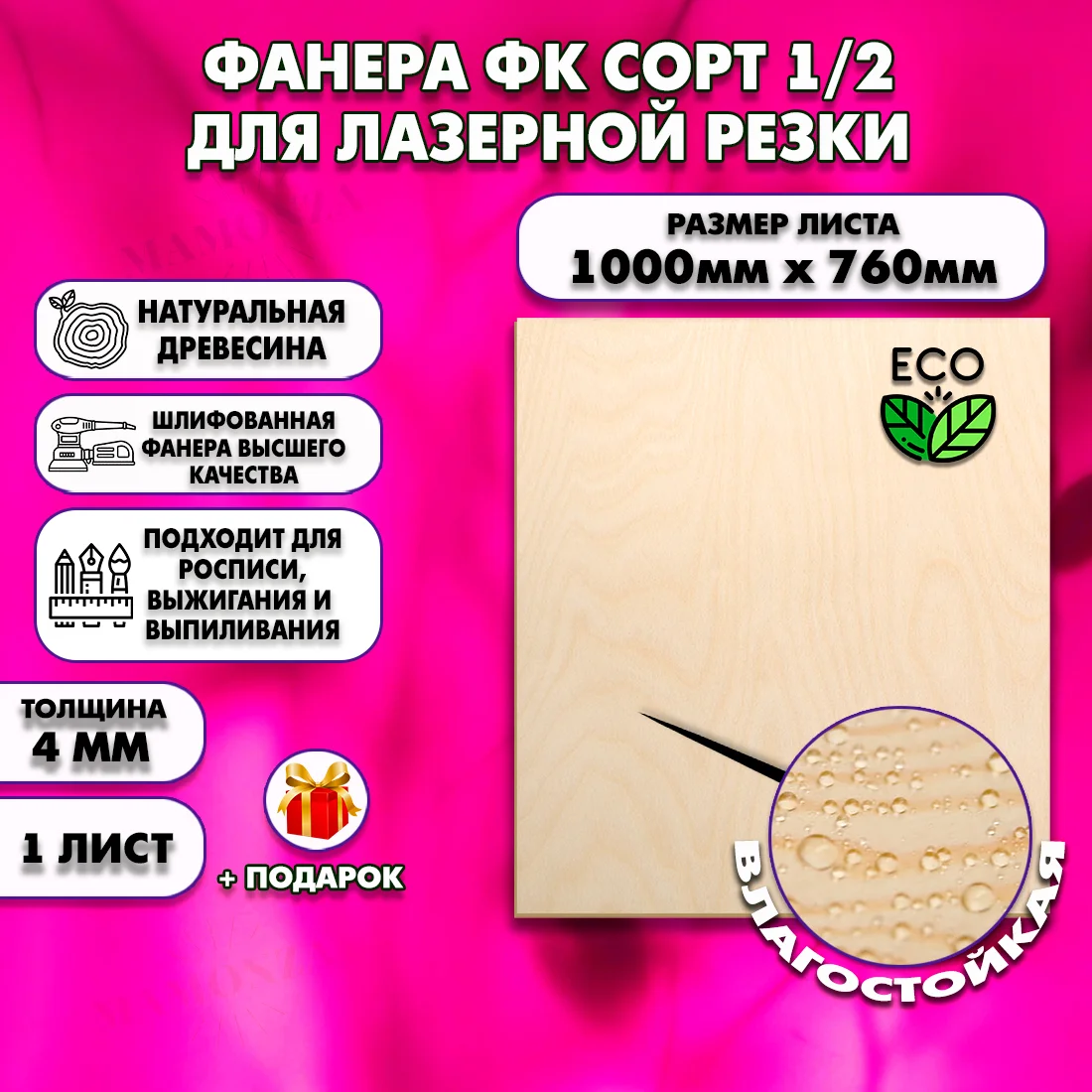 Совет эксперта: Фанера 4 мм — оптимальная толщина для лазерной резки: чистый рез без обугливания. Подходит для ювелирных заготовок, шкатулок, пазлов.