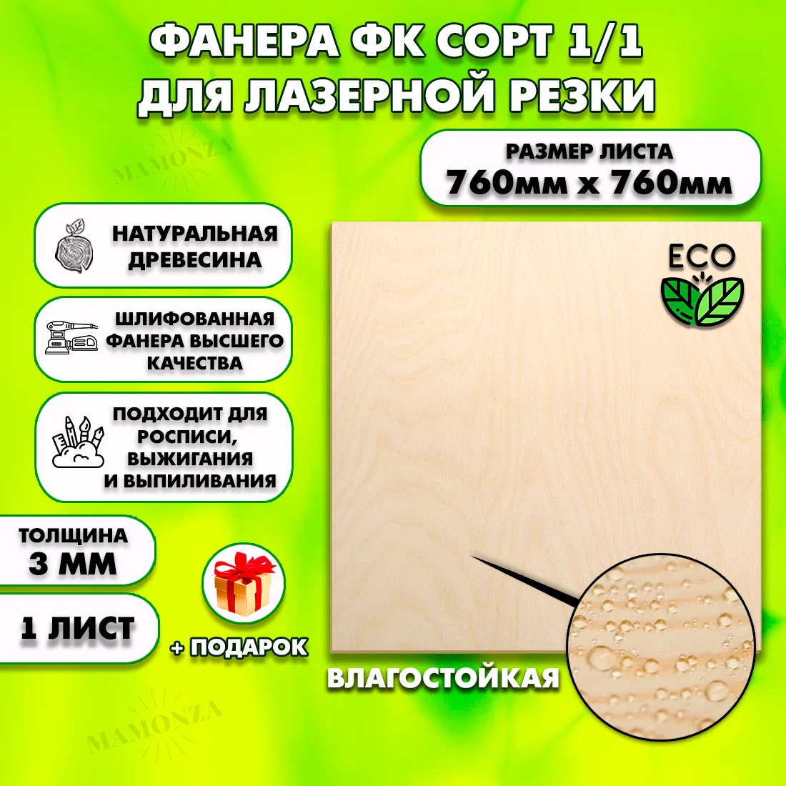 Фанера ФК 1/1 толщиной 3 мм — это материал без компромиссов. Лист 760×760 мм идеален для столешницы обеденных столов, крупные панели. Берёзовый шпон класса E1, карбамидный клей ФК — безопасна для детских комнат, кухонь и жилых помещений.
