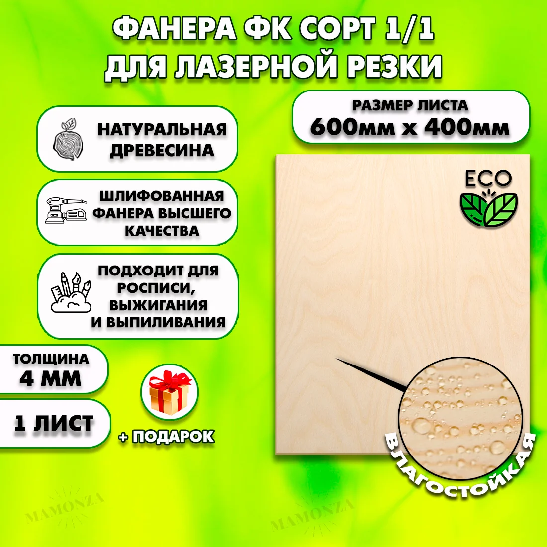 Берёзовая фанера ФК сорт 1/1 — премиальный материал с двумя идеальными сторонами. Лист 600×400 мм толщиной 4 мм (0,24 м², 0.7 кг) — для мебельных фасадов, декоративных панелей и лазерной резки. Обе стороны гладкие, без сучков и трещин — под покраску, лакировку или шпон без дополнительной шлифовки.