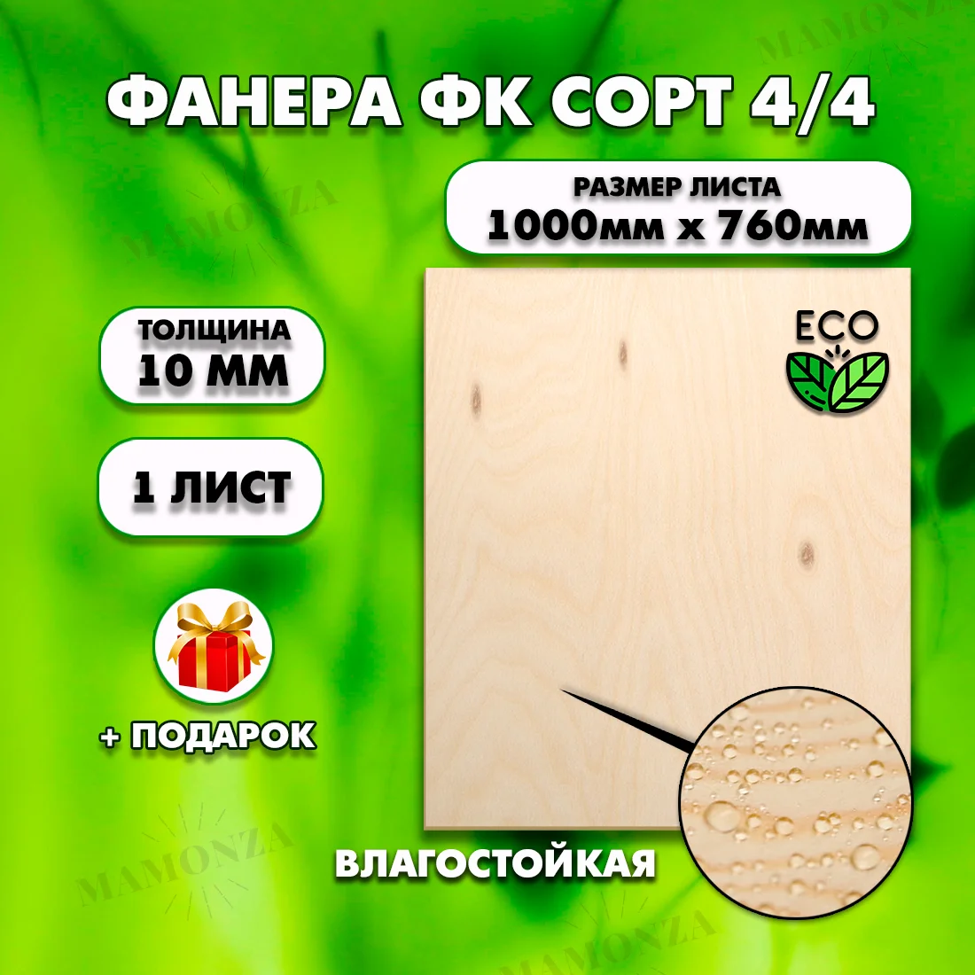 Фанера ФК сорт 4/4 — самый бюджетный вариант берёзовой фанеры. Обе стороны с дефектами (крупные сучки, неровности), но прочность не уступает высшим сортам. Лист 10 мм, 1000×760 мм (0,76 м², 5.2 кг) — когда внешний вид не важен, а важна надёжность.