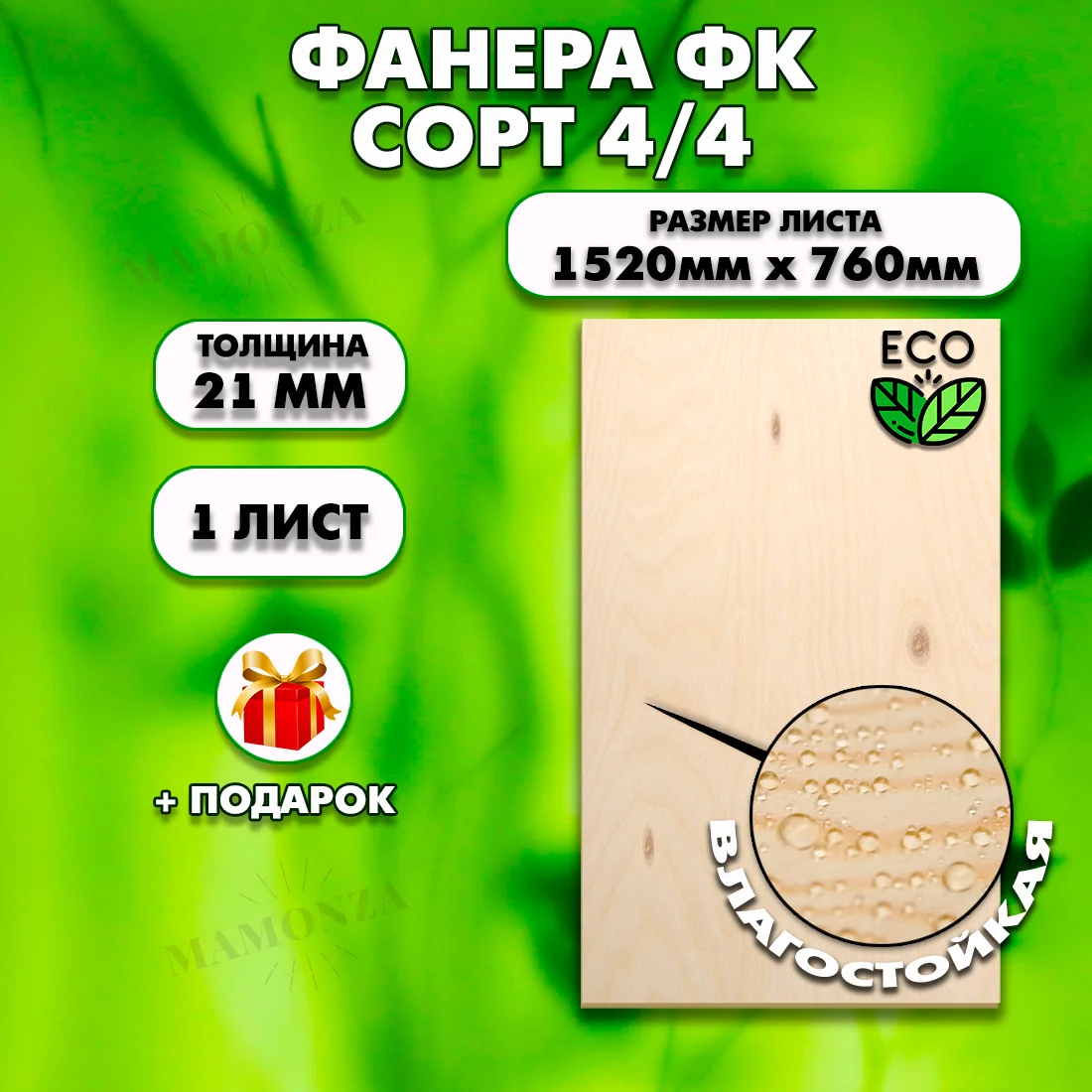 Фанера ФК 4/4 толщиной 21 мм — максимум прочности за минимум денег. Лист 1520×760 мм (1,16 м²) для большие мебельные панели, обшивка стен. Берите этот сорт для скрытых работ: черновые полы, обрешётка, подложка под напольное покрытие.