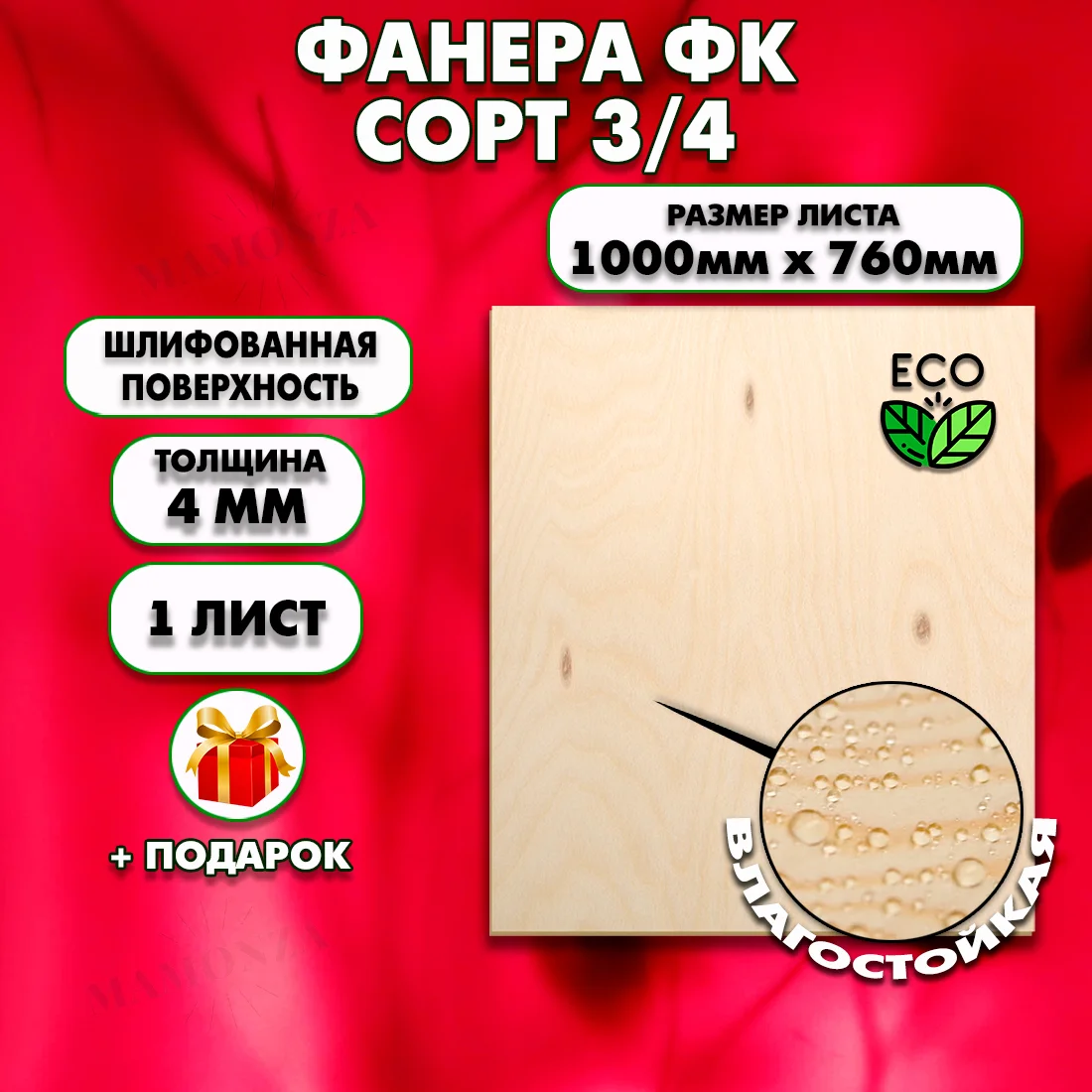 Фанера ФК 3/4 толщиной 4 мм — экономичное решение для строительства. Лист 1000×760 мм (0,76 м²) подходит для обшивка стен и потолков, основа под ламинат. Клей ФК, класс E1 — безопасна даже в жилых помещениях, хотя чаще используется для скрытых конструкций.